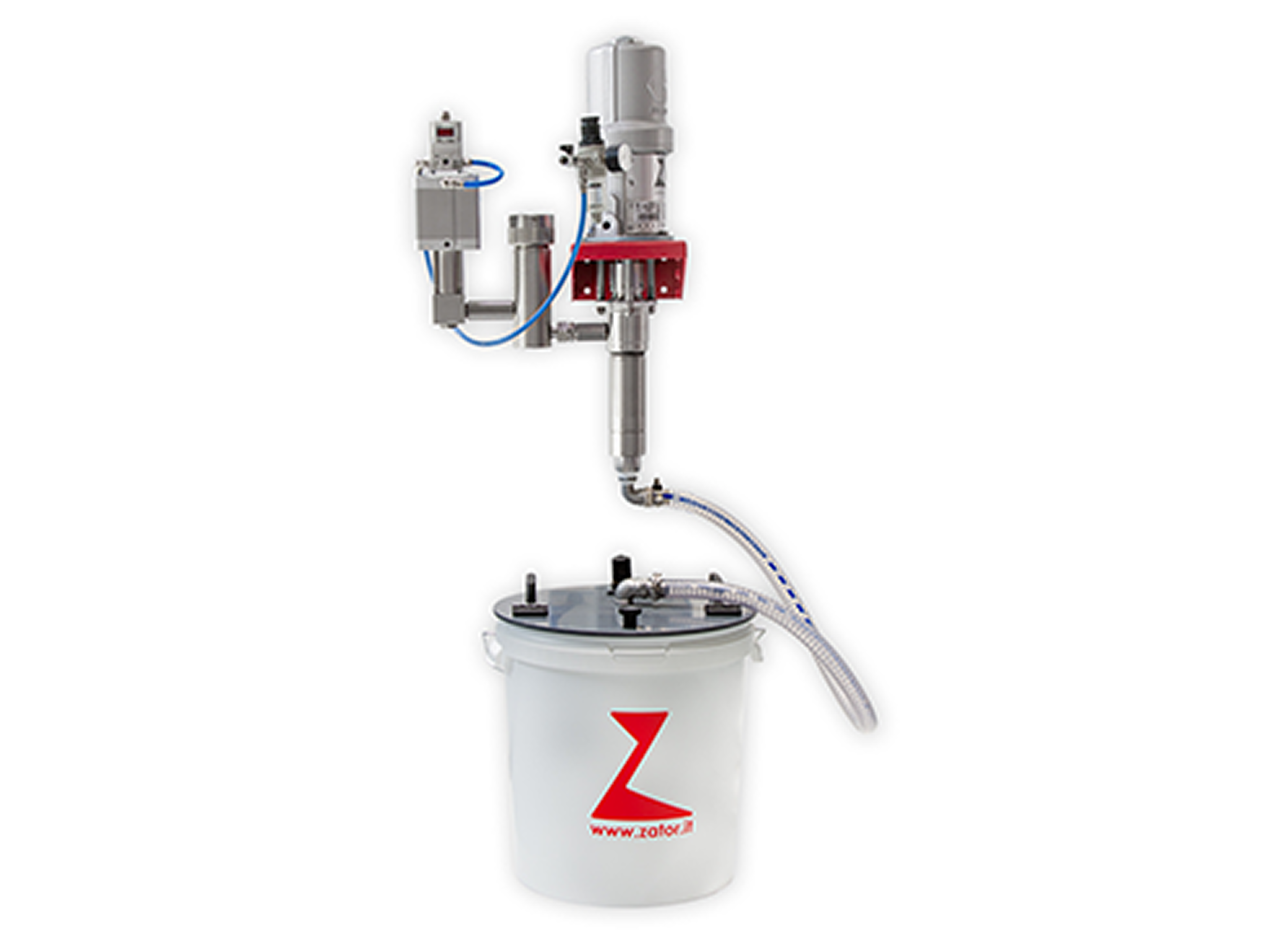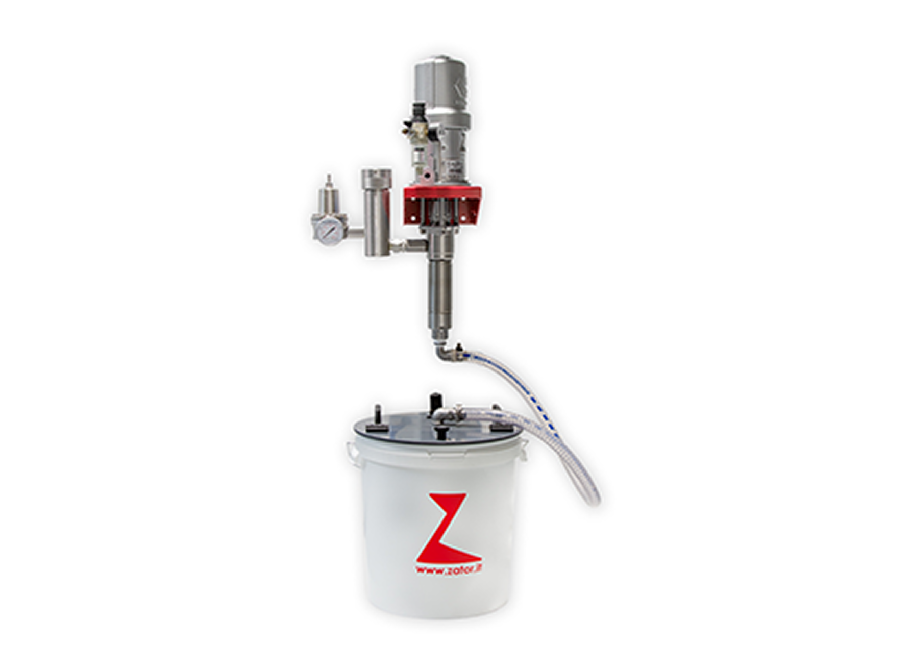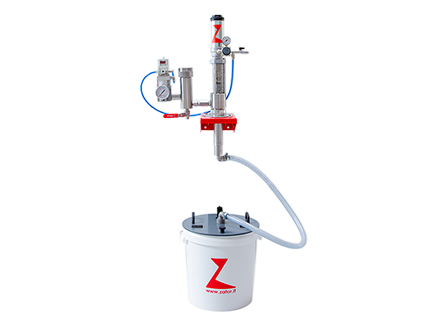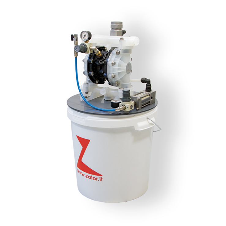 Wiadro połączone jest z pompą za pomocą elastycznej, wzmocnionej rury. Napełnianie wiadra i kontrola są ułatwione dzięki klapce zamykanej na zawiasach na pokrywie wiadra.
