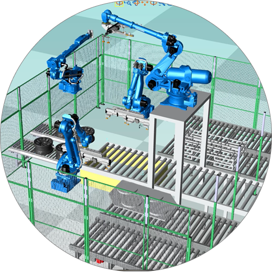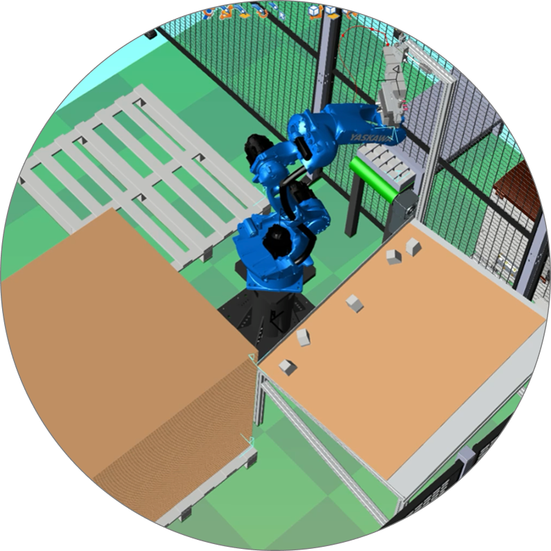 Symulację zautomatyzowanej linii produkcyjnej w środowisku MotoSim. Trzy roboty przemysłowe firmy Yaskawa pracują w ogrodzonej strefie bezpieczeństwa w procesie depaletyzacji i paletyzacji felg samochodowych.