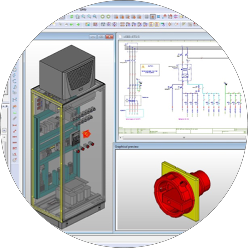 Obraz przedstawia integrację różnych aspektów projektowania w oprogramowaniu EPLAN – od tworzenia szczegółowego schematu elektrycznego (2D), poprzez dobór i umieszczanie komponentów (podgląd), aż po finalny, zoptymalizowany montaż w szafie sterowniczej (3D).